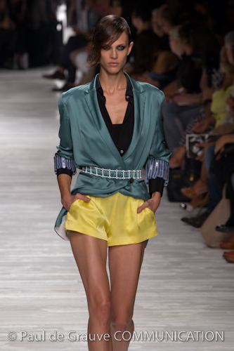 Giacche dai volumi squadrati, abbinate a grandi T-shirt in pelle dal taglio minimale.