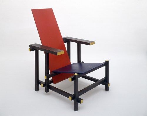 Composition with Red, Yellow and Blue del 1921 di Mondrian: astrazione, essenzialità delle forme e delle linee principalmente orizzontali e verticali, colori primari come il rosso, giallo e blu e i non colori bianco e nero, solo quadrati e rettangoli, in parole povere il superamento dai codici formali del classicismo e dalla convenzione della prospettiva rinascimentale. Così in architettura e nel design Rietveld si pone come un’anticipazione del Movimento Moderno, in particolare sulle ricerche astratte e sulle sperimentazioni della Bauhaus.