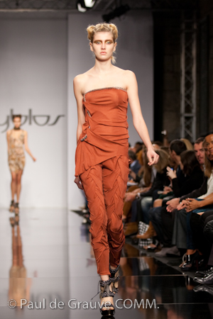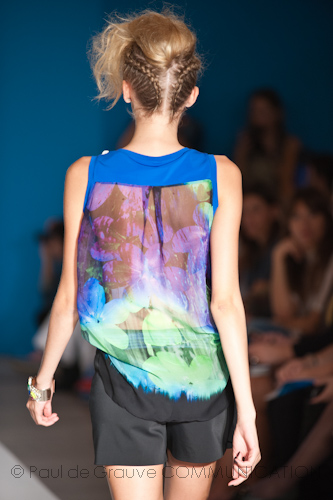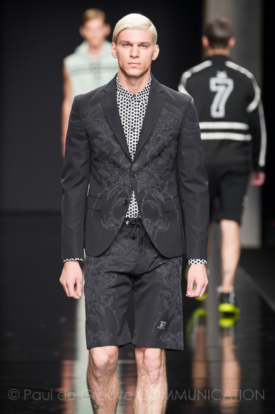 I colori dei capi riflettono questa scelta; la tonalità predominante è l’argento insieme con altre tinte luminose come il bianco, il verde menta, l’azzurro ed il perla. Le stampe sono realizzate in patchwork di coccodrillo, iguana e pitone, temi che da sempre caratterizzano la Maison Cavalli. Oltre ai più classici giacca e pantalone dal design regolare e semplice, lo stilista ha creato kaftani e sottovesti dalle tinte tie-dye le cui linee fluttuanti le immagini sfocate che scorrono sullo schermo di un cinema d’ antan.