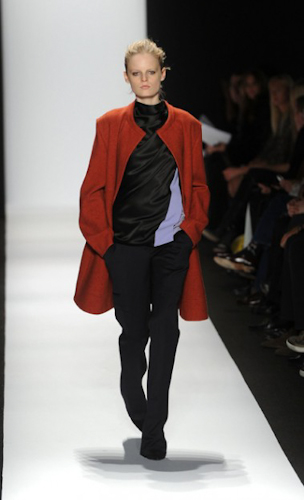 I truccatori hanno scelto una linea molto geometrica e quindi si è cercata una omogeneità tra il trucco e le mani. Un design geometrico quindi, su una base color incarnato a effetto lucido, si è creata una linea verticale laterale verso l’esterno. Vuole essere un gioco in contrasto con il mood della sfilata che è più tribale.