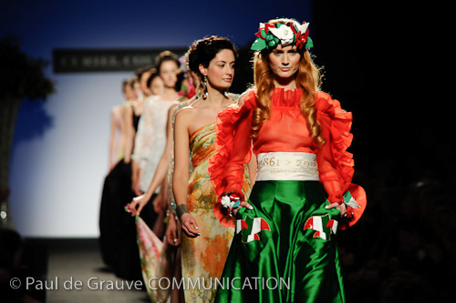 Il beauty look di questa collezione è tra i più interessanti visti finora, durante questa Settimana della Moda. Non soltanto per il colore d’impatto sugli occhi che divengono qui i protagonisti del look, ma per l’idea che vi è dietro: cioè la volontà di cercare un’unicità nelle modelle, cosa che è totalmente inusuale per le passerelle del prêt-à-porter, dove l’individualità delle indossatrici viene annullata per creare un look standard e omogeneo.