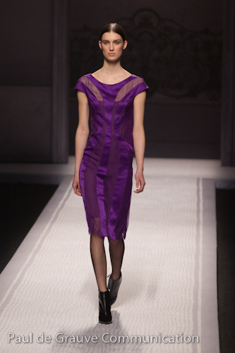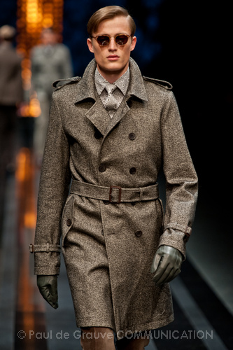 Geometrie, disegni floreali muovono morbidi velluti, che sono forse il punto di forza di questa collezione, le righe si moltiplicano su abiti e gilet ed elaborati ricami arricchiscono giacche e cappotti. Colori della sfilata sono il blu tono su tono, il nero, il bordeaux, il verde e l’oro presente su diversi capi. Una collezione tutto sommato luminosa, pur nello stile formale di Canali, che strizza l’occhio a qualche stravaganza anni sessanta, è la Londra dei Beatles quella che affiora pur restando sempre elegante e contemporanea.