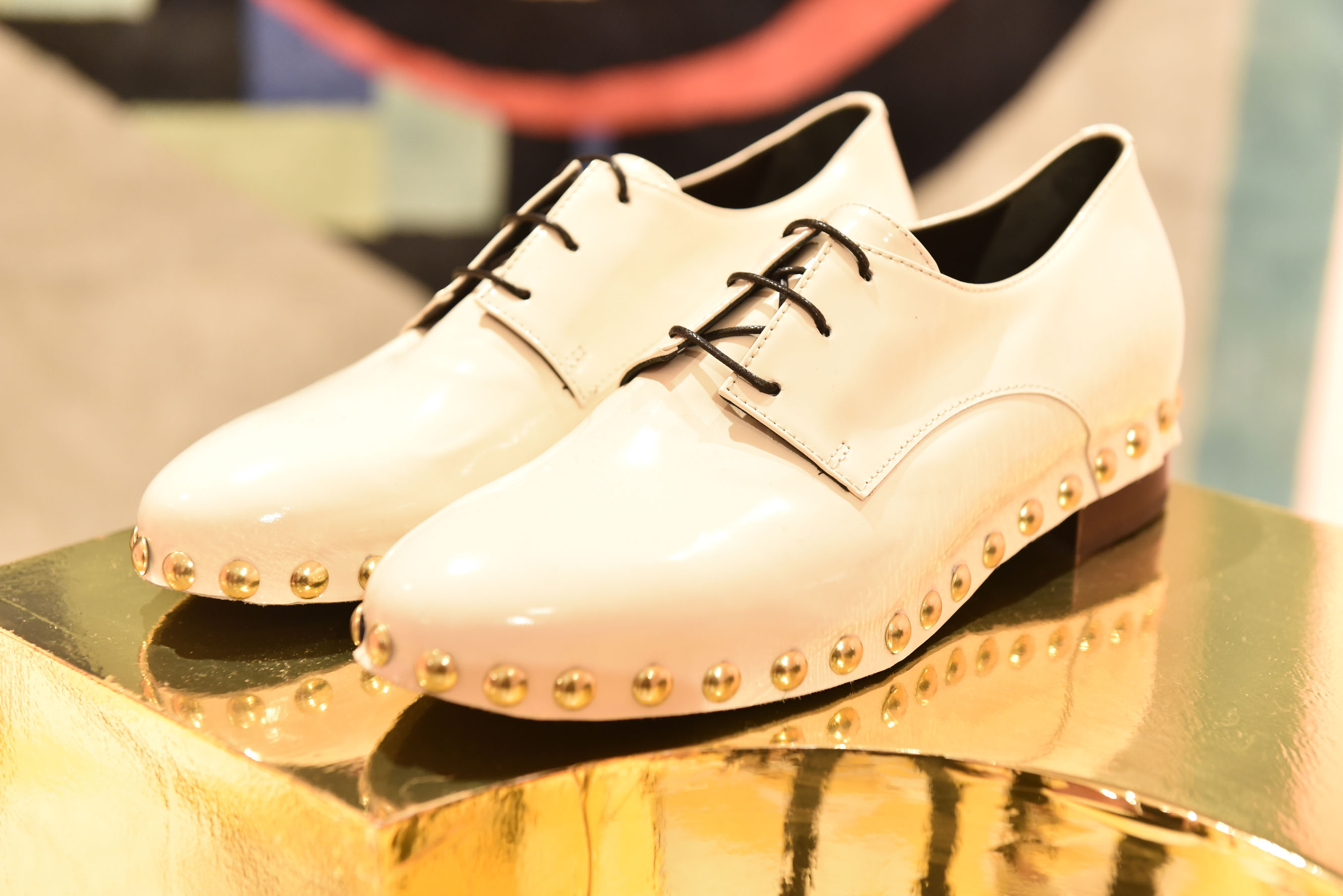 color che decorano modelli flat dalla punta affusolata e stivaletti: un tema sviluppato tra ferri di cavallo, spille da balia e frecce e foglie di piante speciali.