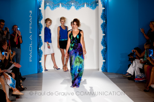 Mix di colori e di stampe : dal blu elettrico dell’elegante salopette ai motivi floreali di cui Paola Frani è innamorata specie dell’orchidea, che riproduce anche nella scenografia della sfilata. Abiti lunghi in jersey, stampe zebra e animalier concorrono alla creazione di onirici effetti ottici. Giochi di trasparenze sottolineano la leggerezza della collezione.