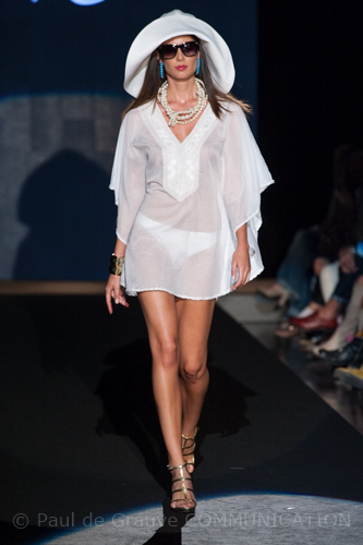 Le lane sono colorate e il lamè è lavorato jacquard con motivi geometrici. Completano il quadro ricami su doppia georgette con effetto tridimensionale, stampe flock e file coupé su nylon.