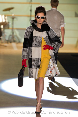 I colori della collezione sono: verde menta, giallo girasole blu e rosso brillante. I materiali pellicce, pelle, denim jeans.