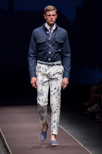 Citazioni dai guardaroba maschili, con le T-shirt, Polo, Shorts, Trench e lo stile equestre. Il new look evoca atmosfere da inizio secolo coniugate con una moderna e futuribile eleganza. Un esempio? la camicia da uomo decostruita che si fa abito per lei. Il bianco è dominante ed è accecante , il colore irrompe con il blu persia e l’ocra oppure tramite le trasparenze.