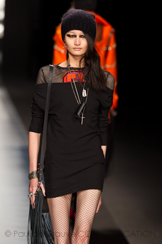 Le contaminazioni e i mix sono tante ma non viene mai dimenticata la vestibilità. Si tratta di contaminazione anche la ripresa di capi da uomo da parte di lei: la camicia da uomo è un must e il chiodo ricorda i bomber sportivi di lui. Anche i capi da “brava ragazza” come il montgomery si incattiviscono concolori accesi e borchie applicate in dengradè anche sul vestito in pizzo.