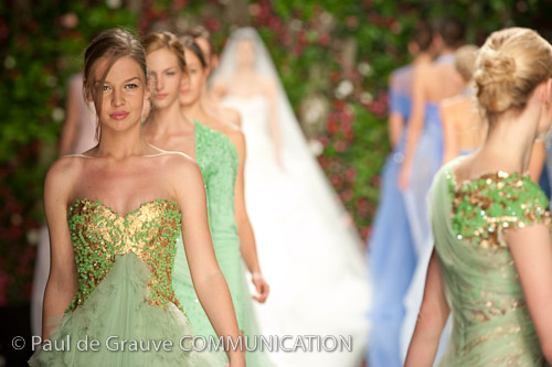 Il tema controverso della libertà di stampa, che ebbe in tutti i paesi, e in particolare in Italia, un’evoluzione complessa, con fasi di progresso e periodi di repressione e censura, arriva ai giorni nostri sulle passerelle dell’Alta Moda di Roma: la provocazione della maison Gattinoni durante la presentazione della collezione haute couture Autunno Inverno 2010-2011 firmata Guillermo Mariotto, dove abito di punta della collezione, It Girl, è un vestito da sposa-bavaglio in raso lucido bianco. Una provocazione fortemente voluta dal direttore creativo che inneggia alla libertà , come l’anno scorso era per quella in Iran, quest’anno è per quella di stampa; ma la collezione di Gattinoni a parer nostro non ha bisogno di polemiche. Per nulla banale, provocante, amante degli eccessi, il vestito è protagonista a 360°, la collezione di Guillermo Mariotto vuole ragazze nude sotto i seducenti abiti: sandali in camoscio e calze lavorate a rilievo, con ricami che ricordano tatuaggi all’hennè, le ragazze ribelli Gattinoni sono viaggiatrici instancabili, che indossano lipstic ring in oro e diamanti di oltre dieci carati, gioielli di Gianni De Benedittis che ha disegnato l’intera collezione. Guerriere, figlie della globalizzazione e della società multietnica, le donne Gattinoni giocano all’interno di un melting pot di culture, tradizioni e religioni, i materiali sono innovativi: intrecci di fili di platino si trasformano in giacche-armatura che vengono accompagnate da pantaloni scultura in gazar di seta, ricordando gli antichi guerrieri samurai; gli abiti preziosi, sono sperimentazioni tessili concepite al computer, realizzate con oltre 2500 ore di lavorazioni.