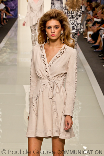 Il distintivo taglio sartoriale, sempre elegante e raffinato, è attualizzato dalla scelta di tessuti non convenzionali. La seta è protagonista in ogni momento della giornata: l’abito di seta pura o di seta cotone è sdrammatizzato di giorno da polo a effetto traforato, per assumere alla sera un tocco di eccentricità grazie all’accostamento a camicie di seta leggera, un po’vintage, a stampa tropicale. La ricerca di dettagli eleganti anche per il tempo libero si traduce in blouson in nappa traforata e in capi più lunghi ma sempre doppiati in seta. Di sera il tessuto si fa più ricercato con abiti e soprabiti in taffetà, sete doppiate con trafori al laser e shantung ad effetto cangiante.