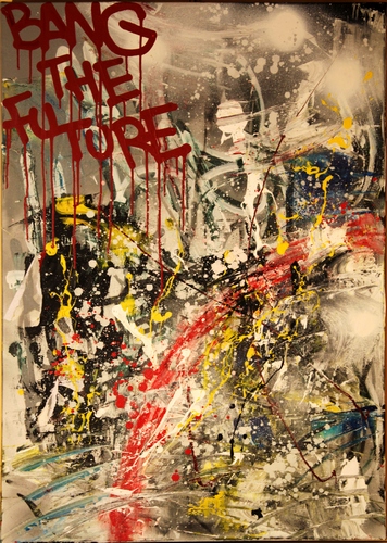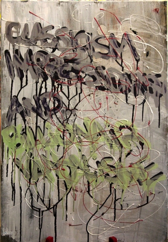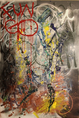 C’è da ribadirlo, se i graffiti non sono un crimine, l’arte va appunto, come ha detto Salinger, perdonata. Atti di vandalismo, così è stata definita per lungo tempo l’arte dei Graffiti nata a Filadelfia nei tardi anni Sessanta sui treni e si sviluppa in seguito a New York negli anni settanta fino a raggiungere una prima maturità stilistica a metà degli anni ottanta grazie alla realizzazione di Style Wars (documentario sui graffiti della metropolitana newyorchese) e del film Wild Style, il fenomeno graffiti si diffuse su scala mondiale, trovando in Europa un fertile terreno. Fungo, che come gli altri writers, si nasconde dietro una cortina di inchiostro, di cartoni spellati, cemento, schiuma refrattaria o vecchi giornali spiegazzati da riciclo, dirante il finissage del 26 maggio ha deciso di sostituire le tele vendute con altre eseguite appositamente per l’evento, l’ultima infatti verrà creata live.