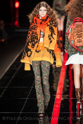 I pantaloni sono slim, abbinati a capispalla con stampe in coordinato o a contrasto. Maglie over, in jacquard dégradé animalier, impreziosite da maniche di seta trapuntata, o in morbida angora a collo alto e senza maniche, si portano con maxi sciarpe avvolgenti.