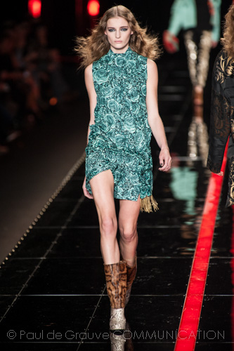 I volumi si riducono per gli abiti, che sono corti e sensuali, abbinati a giacche destrutturate, o lunghi e aderenti, arricchiti da mini gilet in pelliccia. Le stampe, elemento distintivo della Maison Cavalli, si ispirano agli abiti tradizionali della cultura bhutanese. Sfarzosi ricami realizzati in paillettes metalliche sono applicati non solo su giacche e pantaloni ma danno un tocco di luce anche ai capi in denim. Toni accesi che richiamano i colori caldi dell’Asia: blu, arancio, giallo, rosso, giada.