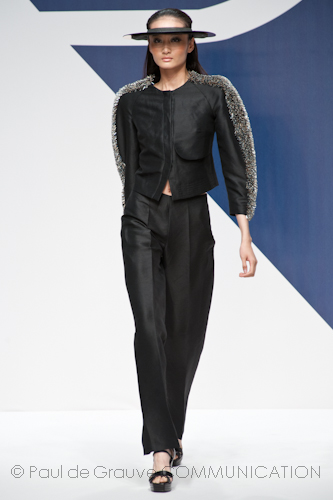 In primo piano i capispalla: la giacca sei ottavi, bianca e giallo tenue dalla vita in giù, stretta dalla cintura in tessuto, si indossa con over pants dalle righe terracotta e cipria dalla gamba larga; la cappa, un classico delle collezioni Musso, ha la manica a giro color polvere. Di un colore tenue, naturale, anche il cappottino in cotone e lino con la manica a tre quarti. Taglio maschile per la giacca in cotone e seta dalla doppia sfumatura di blu notte e blu mare che ne sdrammatizzano il rigore. Da una palette di colori delicati e tenui, spicca il verde deciso della giacca militare con tasche applicate a rilievo, che si porta sulla gonna scultura dipinta a mano.