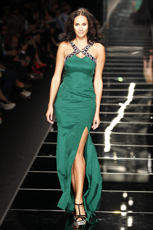 Nella visione di ninfa moderna creata da Missoni ce n’è però per tutti i gusti così vediamo sfilare tailleur-shorts, corsetti e gilet, blouson in pelliccia, cappucci e boxer shorts. Ci colpisce particolarmente il delicato e contemporaneo tailleur casual con pantaloncino sopra il ginocchio. L’accessorio è anch’esso protagonista: baschi colorati, morbidi cappellini e ai piedi tipici stivali da biker. Angela Missoni ci sottolinea il carattere etereo e non aggressivo di una donna che sa passare con disinvoltura dalla pelliccia giallo tenue alla lunga gonna in velluto acquamarina, che sa osare un pò di più con il visone, intrecciato e piegato all’intarsio come fosse un comune maglione o con la maglieria pitonata intrecciata con motivi geometrici. Come dire, il classico femminile firmato Missoni rivisitato in chiave moderna non rischia di certo di passare di moda. La passerella finale è per Ottavio Missoni, fondatore del brand, che da pochi giorni ha compiuto novant’anni, teneramente accompagnato dalla figlia Angela.
