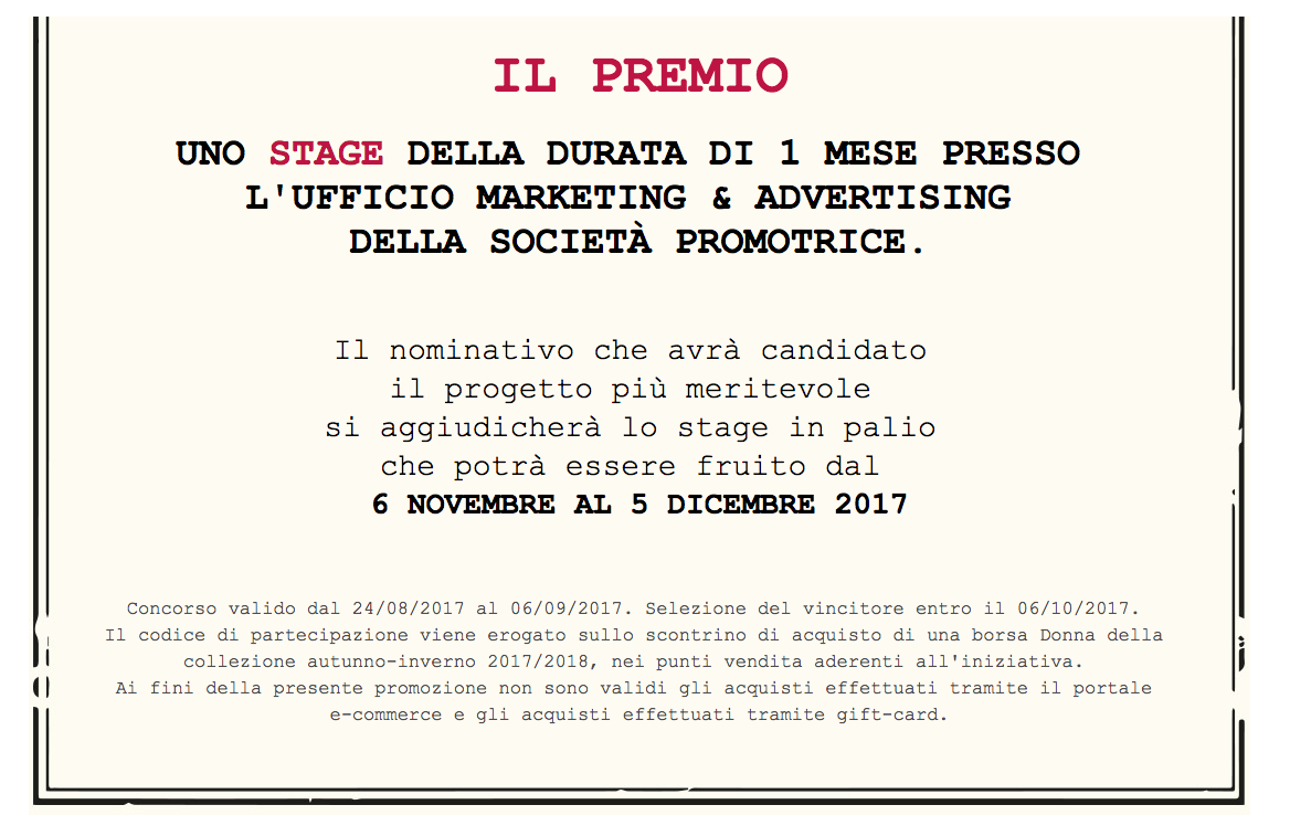 Veniamo al punto, la società Kuvera SpA ( che detiene il marchio Carpisa ) ha lanciato il concorso a premi “Mondo Cultura” (leggi regolamento) ridenominato “VINCI UNO STAGE IN AZIENDA“. Dal 24 agosto al 6 settembre ( concorso lampo!) chi acquisterà una borsa donna della nuova collezione A/I 2017-2018 e avrà tra i 20 e i 30 anni, residente in Italia, potrà partecipare. Allegato a scontrino coupon e curriculum dovrà anche allegare un articolato piano di marketing, elaborato per il lancio di un nuovo prodotto. Il materiale che verrà giudicato da un panel di non specificati “esperti”. Estrazione il 6 ottobre.