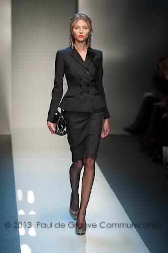 L’austerità si sposa con una sensualità maliziosa: severi tailleur gessati giacca-pantalone lasciano intravedere top in cashmere e pizzo che ingentiliscono la rigorosità del look. Blazer dalle spalle costruite, stretti in vita, sottolineano la silhouette, abbinati a longuette ultra femminili. Asciutti cappotti in cashmere lasciano spazio a impermeabili oversize.