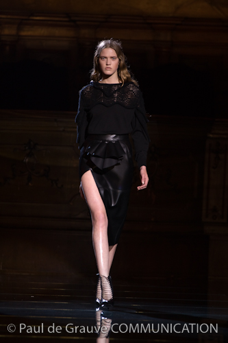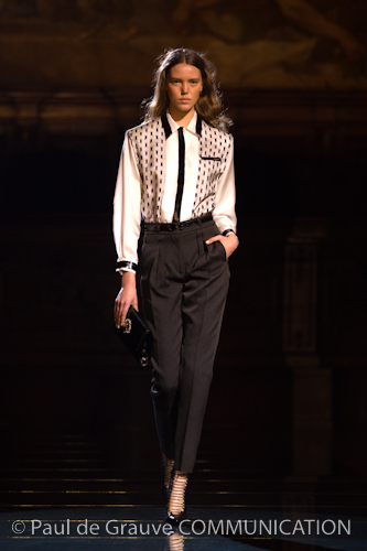 I colori in evidenza sono il bianco abbinato al nero, vaste declinazioni di grigio, sfumature metalliche del verde e del rosa pomplemousse. I materiali sono invece pelle, twill di seta, panno di lana e jersey.