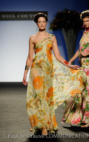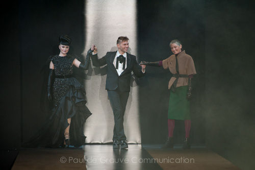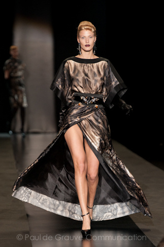 Non possiamo non citare due momenti oltremodo interessanti dello show dello stilista russo. In passerella ha sfilato Benedetta Barzini. Vi domanderete chi sia e, se con la mente state pensando a qualche velina o subrette della tv, siete fuori strada. La sig.ra Barzini è stata una “top model” italiana (quando ancora si usava chiamarle mannequin) e tra i tanti successi di una bella carriera c’è la prima copertina di Vogue Italia, nel novembre del 1965, fotografata da un giovanissimo Gian Paolo Barbieri. Emozionante vederla sfilare ancora una volta, con grande eleganza. Un omaggio di cui siamo grati alla maison Grinko.