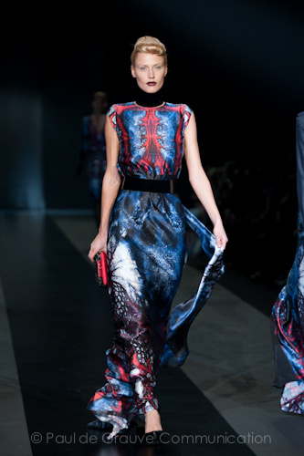 Sergei Grinko è giovane, russo, e ama l’Italia. Ma non basterebbe per farne un designer tra i più promettenti per il futuro. Gradualmente, stagione dopo stagione, Grinko si sta facendo conoscere ed aprezzare per uno stile sfarzoso si , ma anche denso di sperimentazione, riferimenti artistici, culturali, emotivi. Sergei studia al Technological Fashion College di Khabarovs e poi alla prestigiosa Central Saint Martins di Londra. Nelle sue collezioni ci sono le stravaganze certo, di un gusto russo, ma le sue collezioni non sono mai volgari, hanno in se l’opulenza e la sfarzosità ma sempre domate dalla ricerca e dalla passione per la moda. Anche questa collezione donna per l’autunno inverno 2013 ci porta a conoscere un po’ il “mistero” Grinko. “Le mele che cadono nel cielo ” è un titolo bizzarro per una sfilata, se non fosse che dietro al titolo c’è una teoria esoterica proclamata dallo scrittore russo Vadim Zeland nei suoi libri tra cui, uno pubblicato nel 2005, si chiama proprio così.