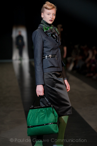 Lasciamo le teorie esoteriche del transferring reality per concentrarci sulla collezione che ripropone modelli in cui un tratto nero percorre e segnala parti di abiti di materiali diversi, congiunti tra loro o semplicemente divisi e demarcati. Sono geometrie eleganti e definite, , tagliate con precisione e attenzione alla silhouette femminile. Non sfugge il richiamo agli anni Quaranta, si ritrova infatti nelle forme classiche dei cappotti, con particolari in pelliccia, e negli accessori piccoli o grandi, dalle spille alle applicazioni per le borse. Le cinture hanno fibie gioiello e alcune cerniere metalliche applicate sulla superficie dei capi, i grandi bottoni in policarbonato e le gocce di silicone lucido nero , inspirati dalle creazioni artistiche di Marcello Gobbi, confermano l’effetto materico tridimensionale che sta diventando il carattere distintivo delle collezioni di Grinko.