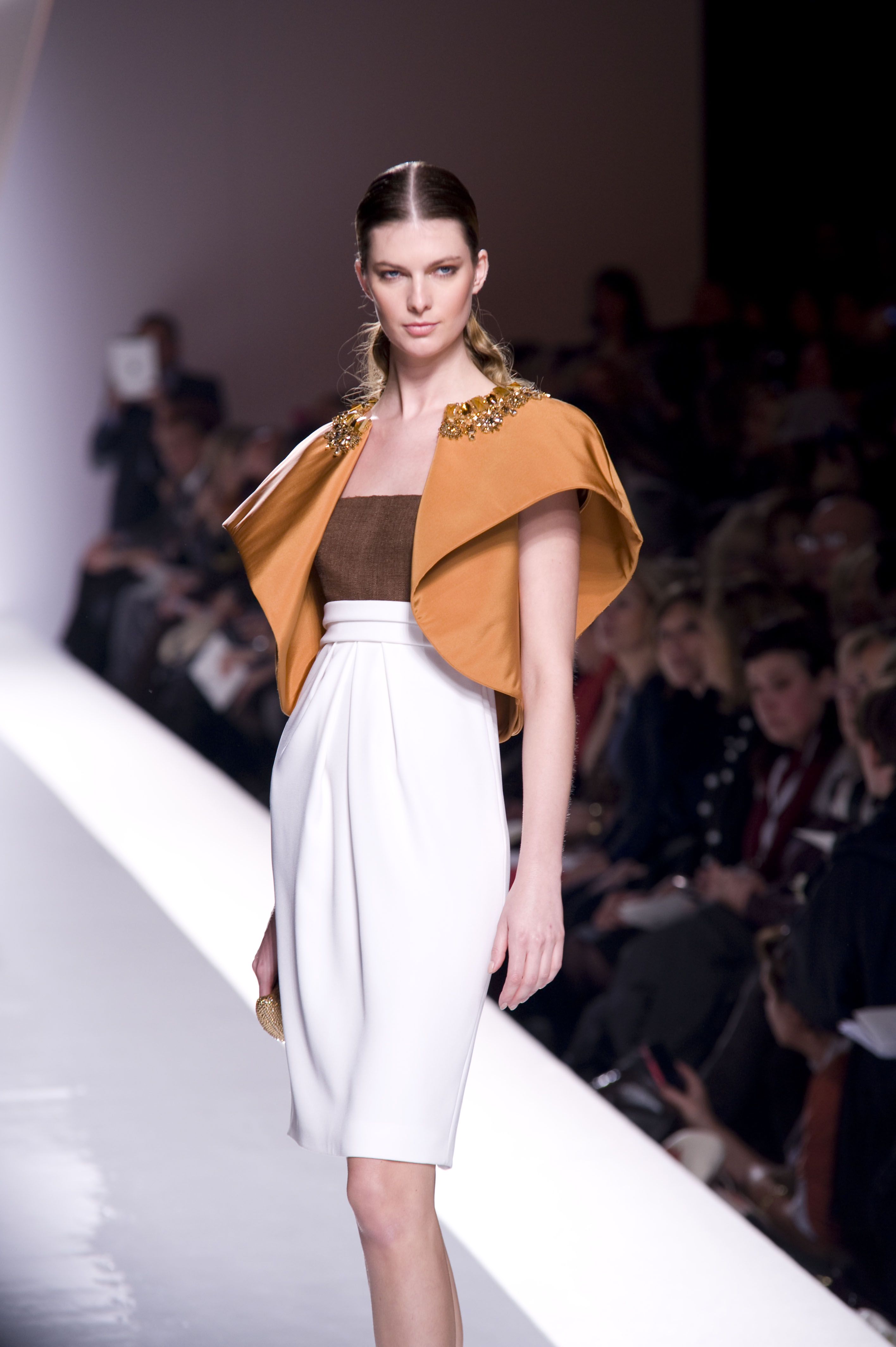 Nella sala Lancisi del Complesso Monumentale di S. Spirito in Sassia si sente lo scalpitio di una vibrante attesa; poi, tra gli applausi, si abbassano le luci e comincia uno spettacolo da favola. Un raggio di un arancio acceso avvolge la firma della Maison; l’atmosfera è gravida d’intensità, generata dai profondi bassi e dalle note sognanti della musica che introduce la prima modella. Indossa un tailleur bianco, reso estremamente sensuale da un profondo scollo che si fa largo lungo la schiena. Preziosi ricami argentei seguono il perimetro che separa il tessuto dalla pelle porcellana in vista.