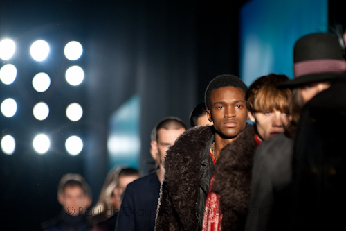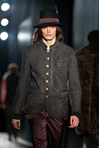 La collezione uomo autunno inverno 2013-2014 si ispira al leggendario chitarrista Jimi Hendrix, con le sue giacche diventate icona del suo stile ineguagliabile, che distorceva quanto il suono della sua chitarra. Dandy nelle linee essenziali e nei tagli eleganti, militare nei dettagli come quelli dei bottoni metallici delle giacche. La palette è ricca di colori che spaziano dai classici neri, grigi e blu navy al bianco, al malva, al verde militare, all’oro antico. Le linee sono asciutte, perfettamente aderenti alla silhoutte, sia per le giacche che per i pantaloni. I completi giacca-pantalone perdono classicità grazie alla ricerca di tessuti sempre innovativi o perché abbinati a camicie dalle grafie particolari, esaltate da collanine di color oro acceso, mai appariscenti, ma sempre ben visibili.