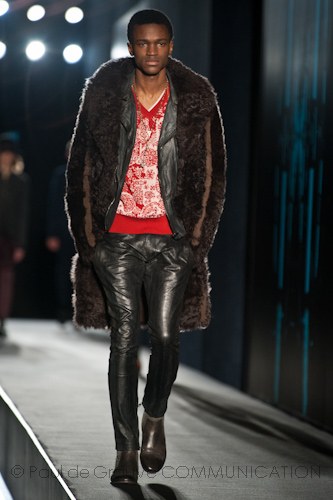 Il denim in primo piano per Diesel Black Gold, un tessuto che nel tempo subisce delle trasformazioni senza passare mai di moda. In questa collezione il denim si fa elegante fino a diventare abito. Pelle laserata, velluto, lana, cavallino intrecciato, pelliccia si inseguono sulla passerella in abbinamenti insoliti ma impeccabili, come il gilet in pelliccia nera accostato alla maglia di lana a collo alto rossa e bianca. Due sono gli elementi grafici che esaltano il tema della collezione: l’esagono, che simboleggia Saturno, pianeta che secondo gli astrologi influenza la creatività dei musicisti, e il paisley, un antico motivo tessile indiano di cui si appropriarono negli anni Sessanta gli artisti che avevano inclinazioni verso la spiritualità orientale.