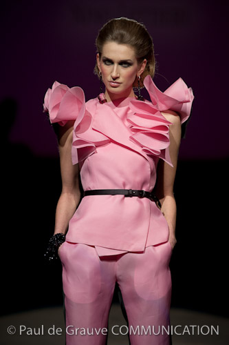 La passerella rappresenta un giardino bagnato in un pomeriggio di mezza estate, su questo manto verde sfilano modelli e modelle a piedi nudi, dando vita a capi destrutturati, un mix di tessuti che osa e diverte.