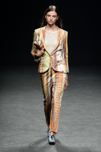 A chiudere la sfilata appare in passerella la scultorea sposa avvolta in una rete di macramè. Gli atipici quadretti scelti per il giorno delle nozze si chiudono all’altezza della vita in un grande fiocco da cui sorge un delizioso strascico.