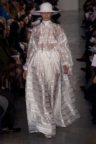 A chiudere la sfilata appare in passerella la scultorea sposa avvolta in una rete di macramè. Gli atipici quadretti scelti per il giorno delle nozze si chiudono all’altezza della vita in un grande fiocco da cui sorge un delizioso strascico.