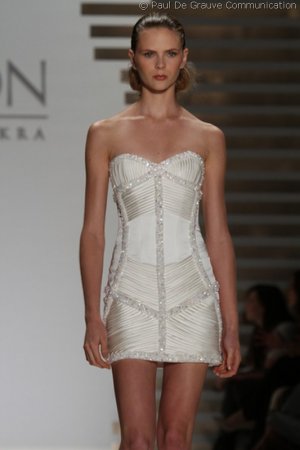 Il primo abito a sfilare è un mini dress aderentissimo. La fame degli occhi è appagata da un orlo trasparente in pizzo. Oltre agli scolli vertiginosi che lasciano scoperta tutta la schiena, di notevole interesse è anche il mini tailleur bianco dai pantaloncini brillanti.