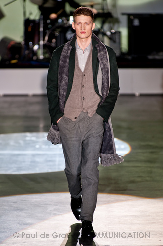 La collezione mixa e stravolge. Trench impeccabili e completi giacca e pantalone dai toni scuri rimandano ad un uomo dal perfetto british style, che però porta sul volto cicatrici ed escoriazioni, come reduce da un combattimento. Il classico cardigan si allunga e si tinge di colori accesi, la camicia è morbida, drappeggiata sul davanti.